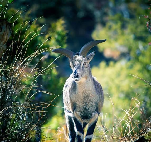 岩羊长得有点像山羊和绵羊的“混血儿”。它们的角像个倒写的“八”字,直直往上,尖得跟刀似的,角上还有一圈圈皱纹和颗粒,看着挺粗糙,其实摸起来滑溜得很。岩羊的毛色也好认:身子青灰色,脸是灰白色,屁股黄白色,尾巴黑乎乎的。它们没有羊膻味,可能是因为整天在山上跑,运动量大,把“味儿”都跑没了。